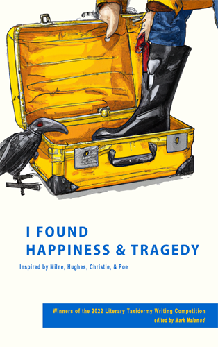 You can find her poem, as well as those of all our short story and poetry finalists, in the 2022 anthology of literary taxidermy I FOUND HAPPINESS & TRAGEDY — Available now as paperback or digital download.
